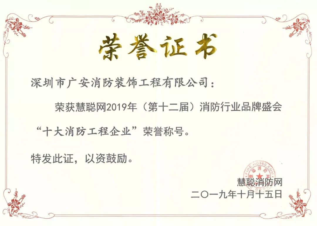 2019年10月15日,CFIC2019中國消防安全產業大會在北京隆重召開。在大會的頒獎盛典上, 深圳市廣安消防裝飾工程有限公司(以下稱“廣安消防”)榮獲“2019年十大消防工程企業”稱號,廣安消防副總經理謝祺先生當選“十大消防工匠”。