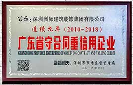 近日,深圳洲際建筑裝飾集團有限公司(以下稱洲際裝飾集團)憑借長期積累沉淀的深厚實力和始終如一的真誠服務,連續九年榮獲“廣東省守合同重信用企業”稱號。