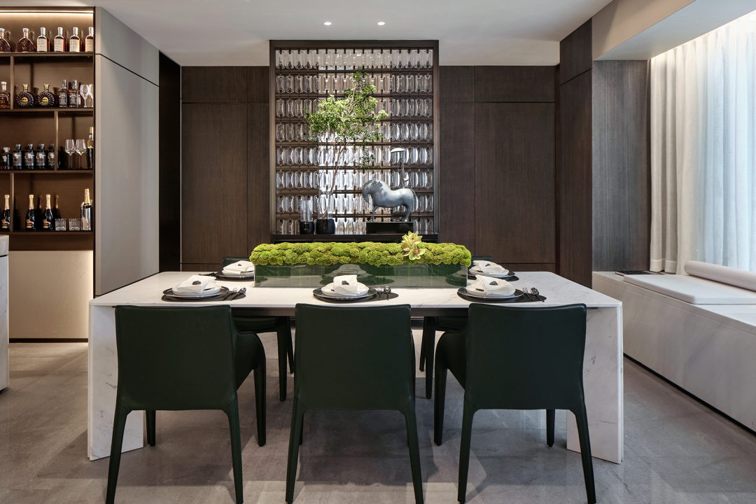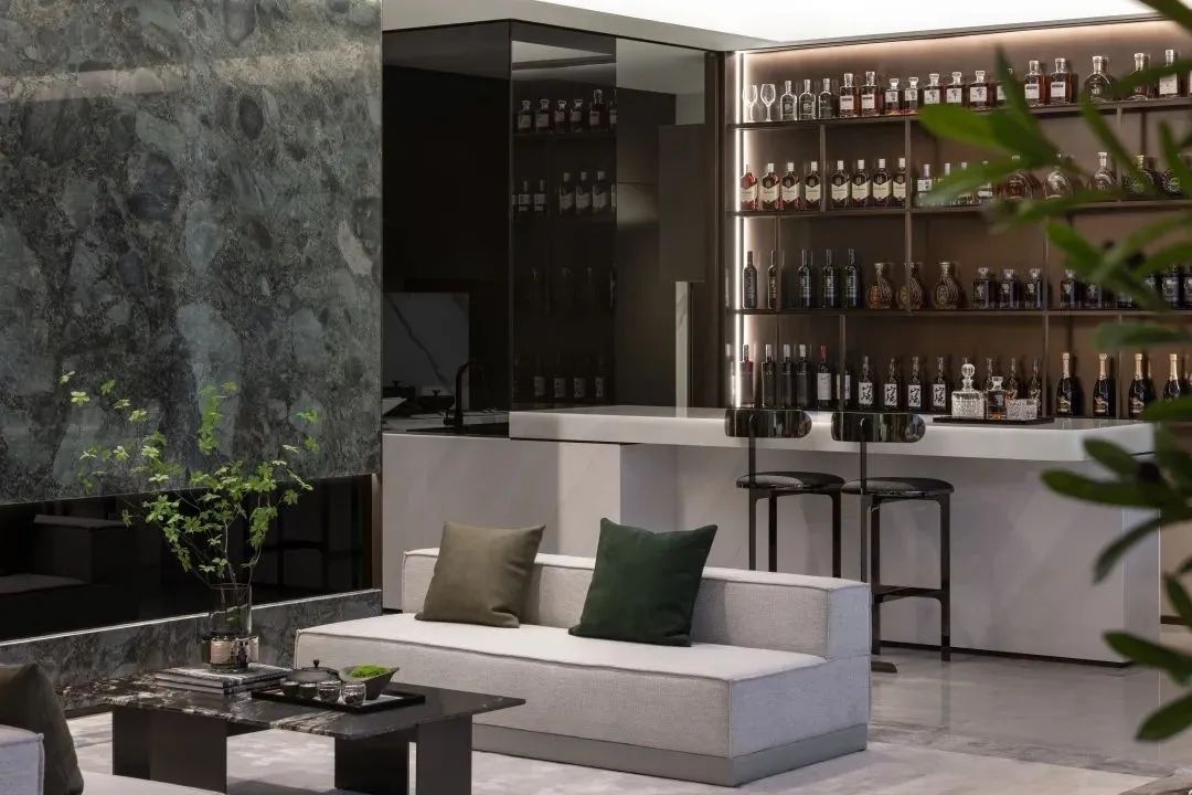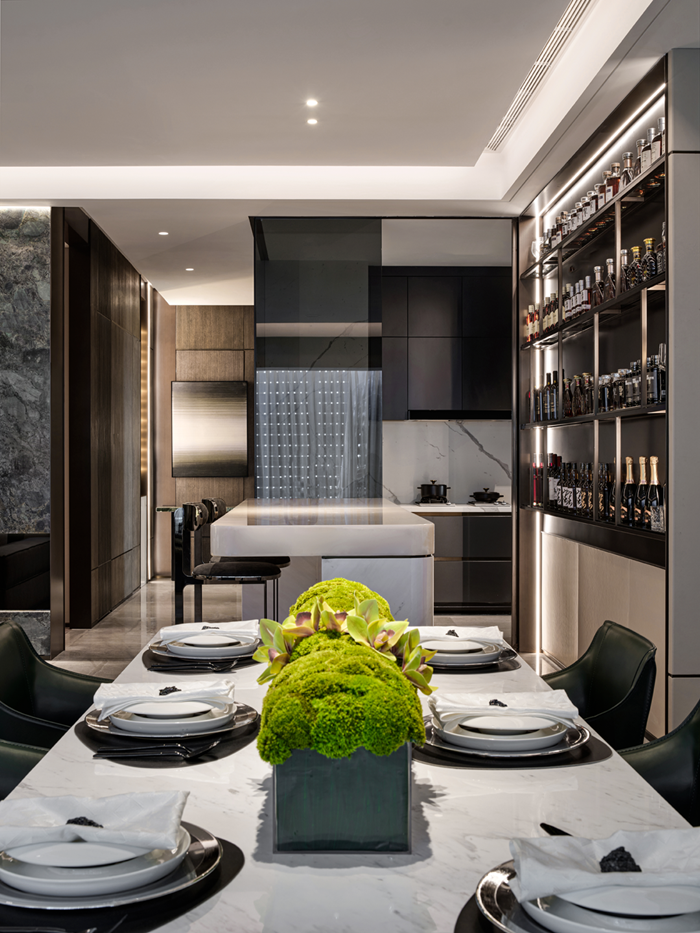 餐廳摒棄常規(guī)餐桌的形式,搭配以穿插的構(gòu)造手法巧妙設(shè)置的中島吧臺,營造一種西廚場景,形成客餐廳聯(lián)通的中西廚格局。此外,客廳與吧臺、餐廳的開敞聯(lián)合,也有效拓展了公共區(qū)域的活動范圍與分區(qū)層次。