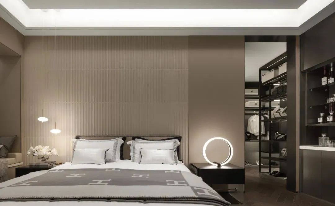 半隱于墻后的置物柜,既巧妙的形成了過渡,又可以讓臥室空間有更利落的視覺效果。