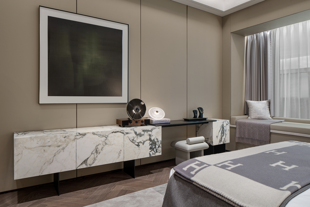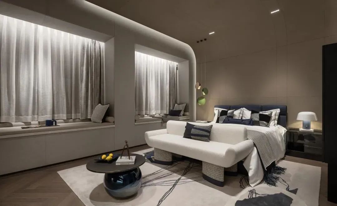 客臥由灰調(diào)鋪陳,傳達出溫情而平和的情緒。靛藍的床頭背板,與灰色系墻面和諧交融,烘托出自然沉穩(wěn)而不失高貴的氣場。床尾圓形茶幾的加入,呈現(xiàn)方中有圓、圓中有方的組合形態(tài),配合地毯上的藝術(shù)畫作,讓一抹優(yōu)雅回蕩其間。
