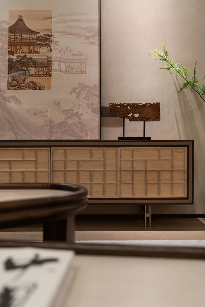 一體式的設計令空間顯得大氣而舒展,客廳是家的社交地點,也是景之所在。空間以南京意境為主題,追敘過往時光。