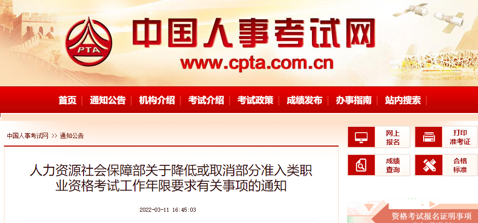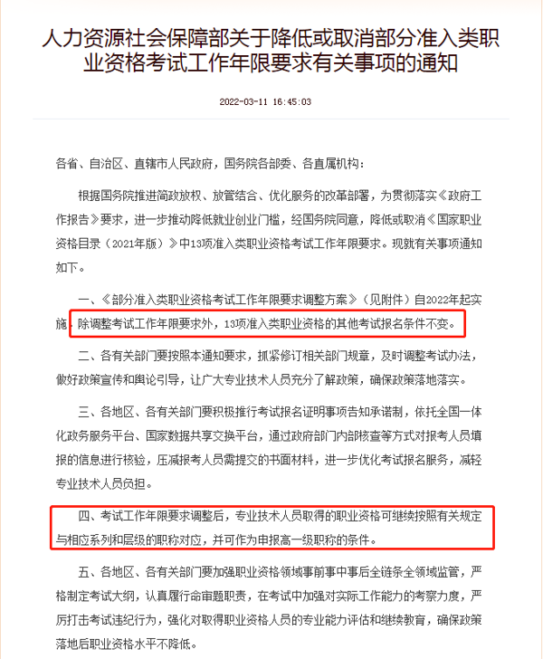 3月11日,中國(guó)人事考試網(wǎng)發(fā)布了《人力資源社會(huì)保障部關(guān)于降低或取消部分準(zhǔn)入類(lèi)職業(yè)資格考試工作年限要求有關(guān)事項(xiàng)的通知》,通知中提到降低或取消《國(guó)家職業(yè)資格目錄(2021年版)》中13項(xiàng)準(zhǔn)入類(lèi)職業(yè)資格考試工作年限要求。其中包括建造師(一級(jí))、造價(jià)工程師、監(jiān)理工程師、注冊(cè)安全工程師(中級(jí))等。