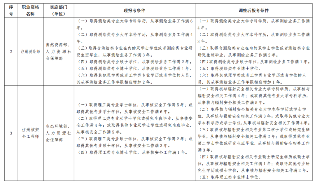 一、《部分準(zhǔn)入類(lèi)職業(yè)資格考試工作年限要求調(diào)整方案》(見(jiàn)附件)自2022年起實(shí)施。除調(diào)整考試工作年限要求外,13項(xiàng)準(zhǔn)入類(lèi)職業(yè)資格的其他考試報(bào)名條件不變。