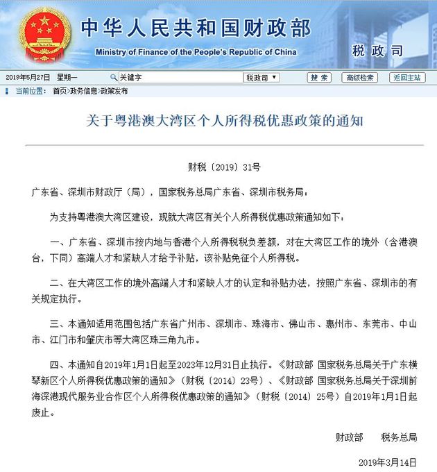 今年3月,財政部、稅務總局聯(lián)合印發(fā)《關于粵港澳大灣區(qū)個人所得稅優(yōu)惠政策的通知》(下稱《通知》)。其中明確: