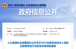 近日,人力資源社會保障部辦公廳印發(fā)《關于2023年度專業(yè)技術人員職業(yè)資格考試計劃及有關事項的通知》,公布了2023年度專業(yè)技術人員職業(yè)資格考試計劃。